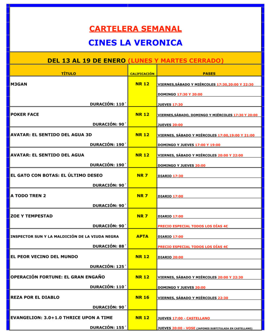 Además, en Cines La Verónica tienen una promoción especial para las familias (y todos los públicos). Las películas «Zoe y tempestad» e «Inspector Sun y la maldición de la viuda negra» irán todos los días a precio reducido de 4 euros. Y el jueves 19 de enero se suman al preestreno nacional de «EVANGELION: 3.0 + 1.0 THRICE UPON A TIME» que se proyectará en castellano (17.00 horas) y en VOSE – japonés subtitulado en castellano – (20.00 horas).