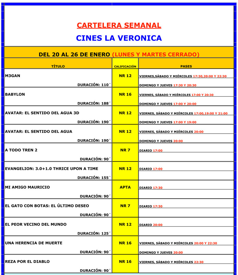 Cartelera de Cines La Verónica del viernes 20 al jueves 26 de enero